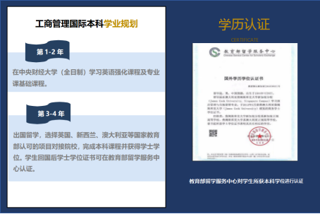 学生在中央财经大学学习两年,这一阶段开设的主要课程有英语的强化培训课程及通识课程。学生完成国内阶段培训课程,达到国外对接院校要求的雅思或托福成绩后,可直接申请进入国外对接院校继续深造,完成国外规定学业课程,获得对接院校大学本科学位,回国后其学历由中国(教育部)留学服务中心予以认证。