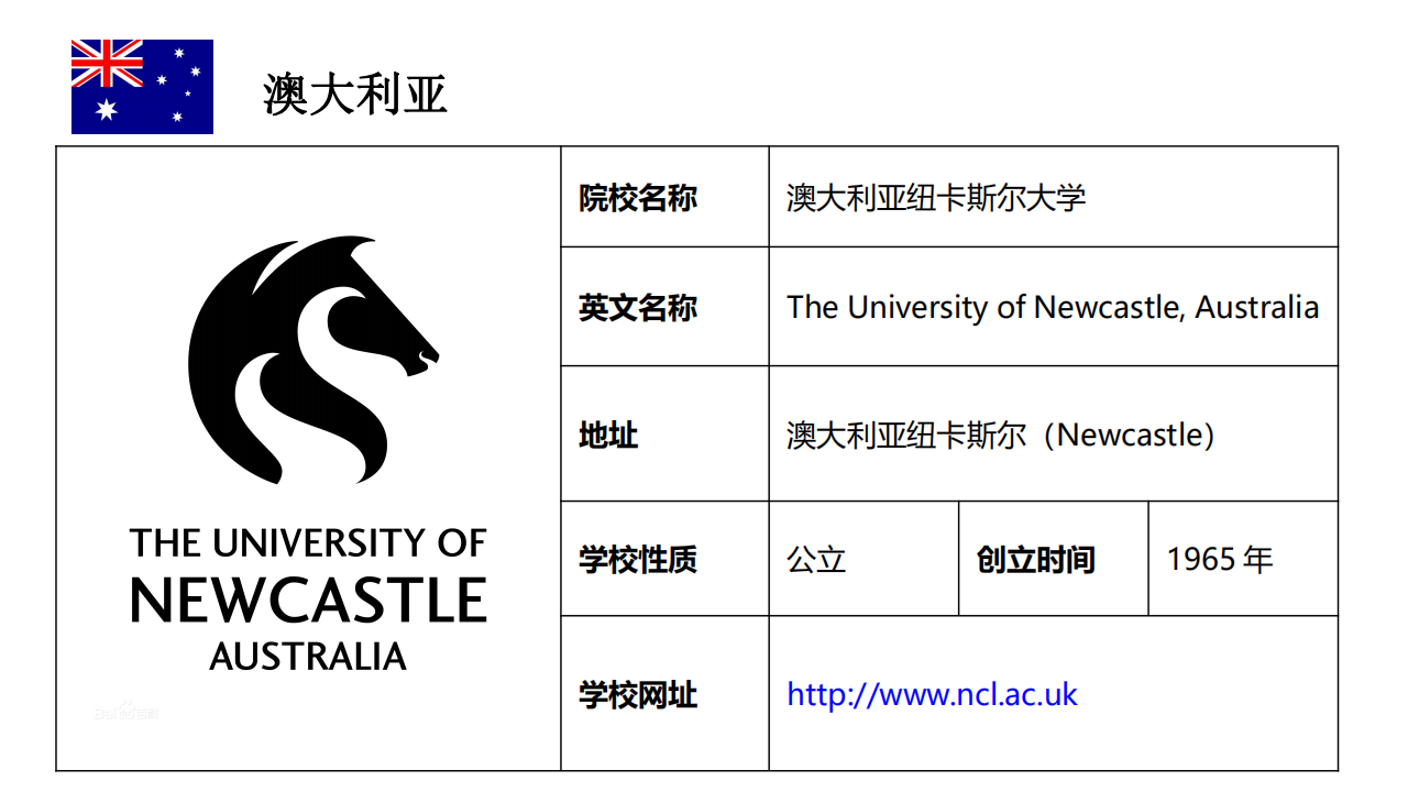 纽卡斯尔大学商学院是世界最高标准AACSB认证的商学院。2020QS世界大学排名第207位。纽卡斯尔大学作为澳大利亚著名的大学,不论在教育还是在研究领域,在澳大利亚都居领先及创新地位,吸引了世界各地高素质的学生和教学人员,也是国际上公认的“由问题指导学习”方法的先驱。学校十分注重海外学生的学习和生活,国际学生办公室定期邀请国际学生参加座谈会,听取学生的意见和建议。同时,学校的学生会每两周组织各类活动。
