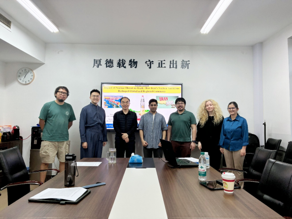 Distinguished attendees, including Professor Cao Mingxing, Dean of the Institute, and Associate Professor Yan Haosheng, actively engaged in the discussion. Both professors provided numerous valuable suggestions that are expected to enhance the quality of Jamsheed's research paper. Their input covered various aspects, from refining the analytical approach to strengthening the argumentation, which will no doubt contribute to a more in-depth and comprehensive understanding of the complex relationship between nuclear threats and international trade.