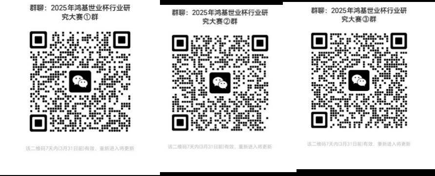 大赛微信群:以下二维码为“鸿基世业杯”沙河高教园区首届暨中央财经大学第十三届行业研究大赛初赛参赛群,请有意向参赛的同学扫码入群,入群请备注学校-专业-年级-姓名。