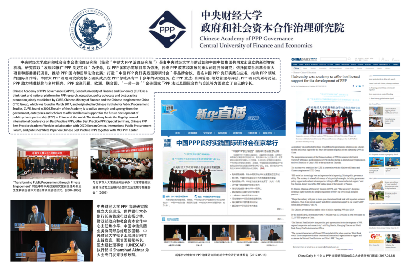 研究院核心团队成员承担了国家社科重大项目PPP立法研究项目,参与国家PPP立法、规范性文件的制订和国家示范项目评审,参与了联合国PPP示范法专家组和中国政府代表团工作,在这项国际标准的制订和形成中发挥了重要作用。参与联合国贸法会立法工作能够反映我国PPP发展模式和良好实践,有助于充分发挥我国高校新型专业智库的作用。