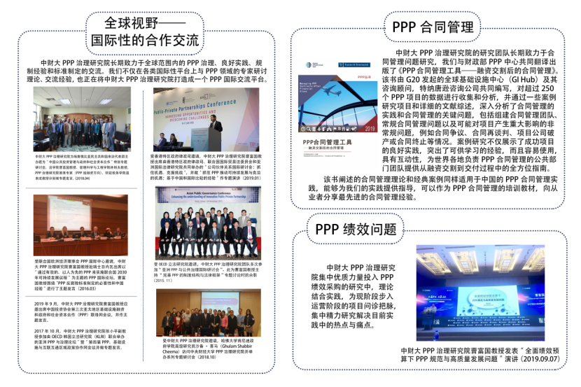 展台分别设立研究院成立、PPP立法研究(承担社科基金重大项目并支持国家和联合国PPP立法和国际标准的制订工作)、PPP助力精准扶贫与乡村振兴研究、融资交割闭合后的合同管理研究、绩效管理研究、“一带一路”和"金砖国家"PPP法律政策研究、国际合作与交流等板块,全面呈现了PPP治理研究院核心团队成员二十多年以来,尤其是研究院成立以来服务于经济社会的成果。