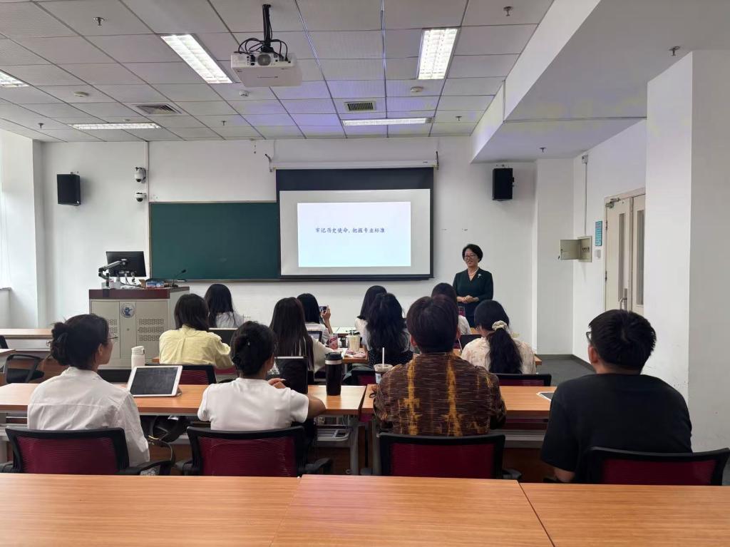 9月10日上午,国际文化交流学院直属党支部书记、院长李春玲教授在中财大厦三层案例7教室以“牢记历史使命,把握专业标准”为题,为2025级国际中文教育专业硕士研究生讲授了精彩的开学第一课。